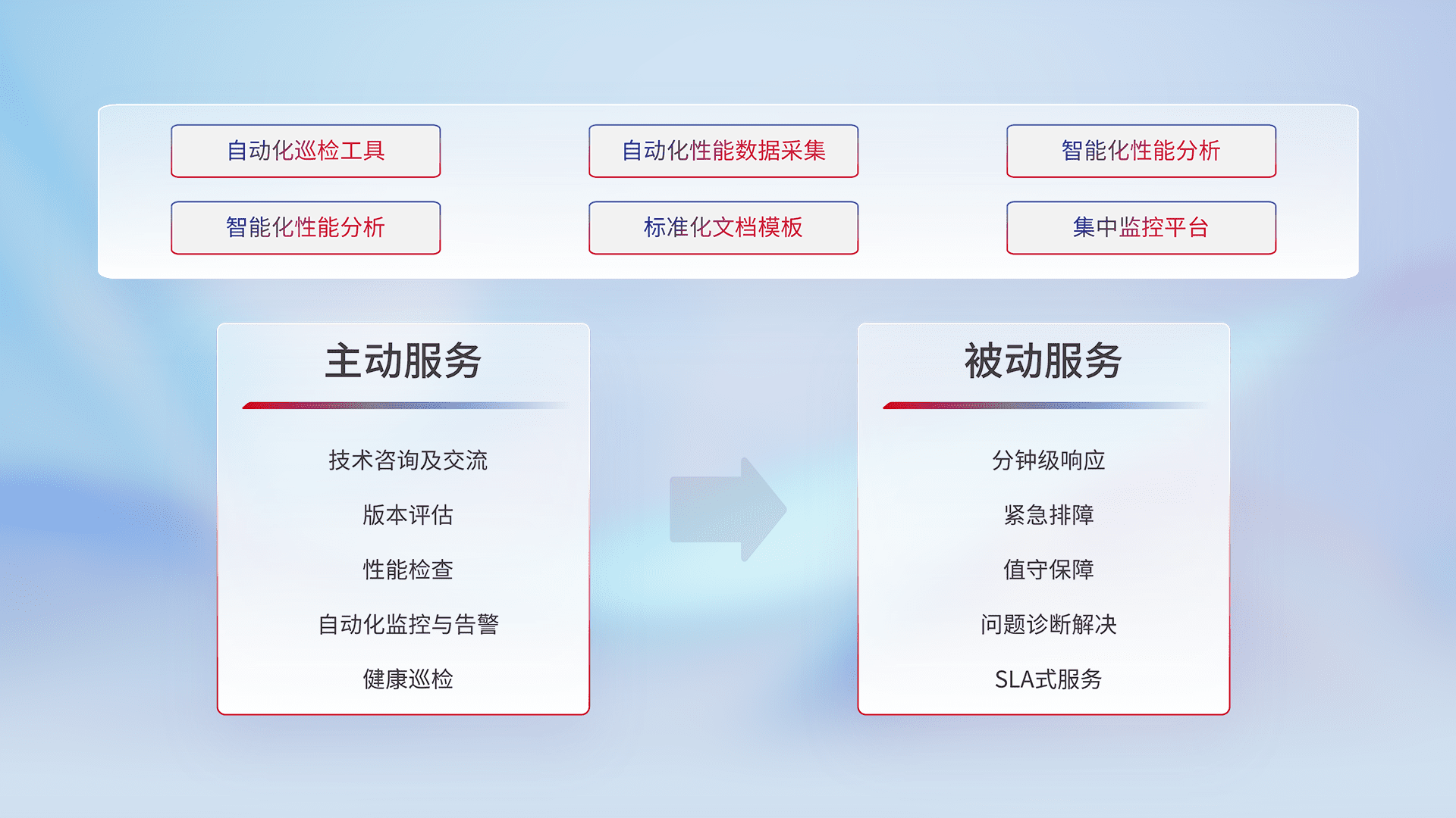 智能化工具和标准化文档,,,,保障服务质量,,,,提供主动服务(包含技术咨询、、版本评估、、、、性能检查、、、、自动化监控与告警、、、健康巡检)和被动服务包含(分钟级响应、、、紧急排障、、、值守保障、、、、问题诊断解决、、、SLA服务)。。。