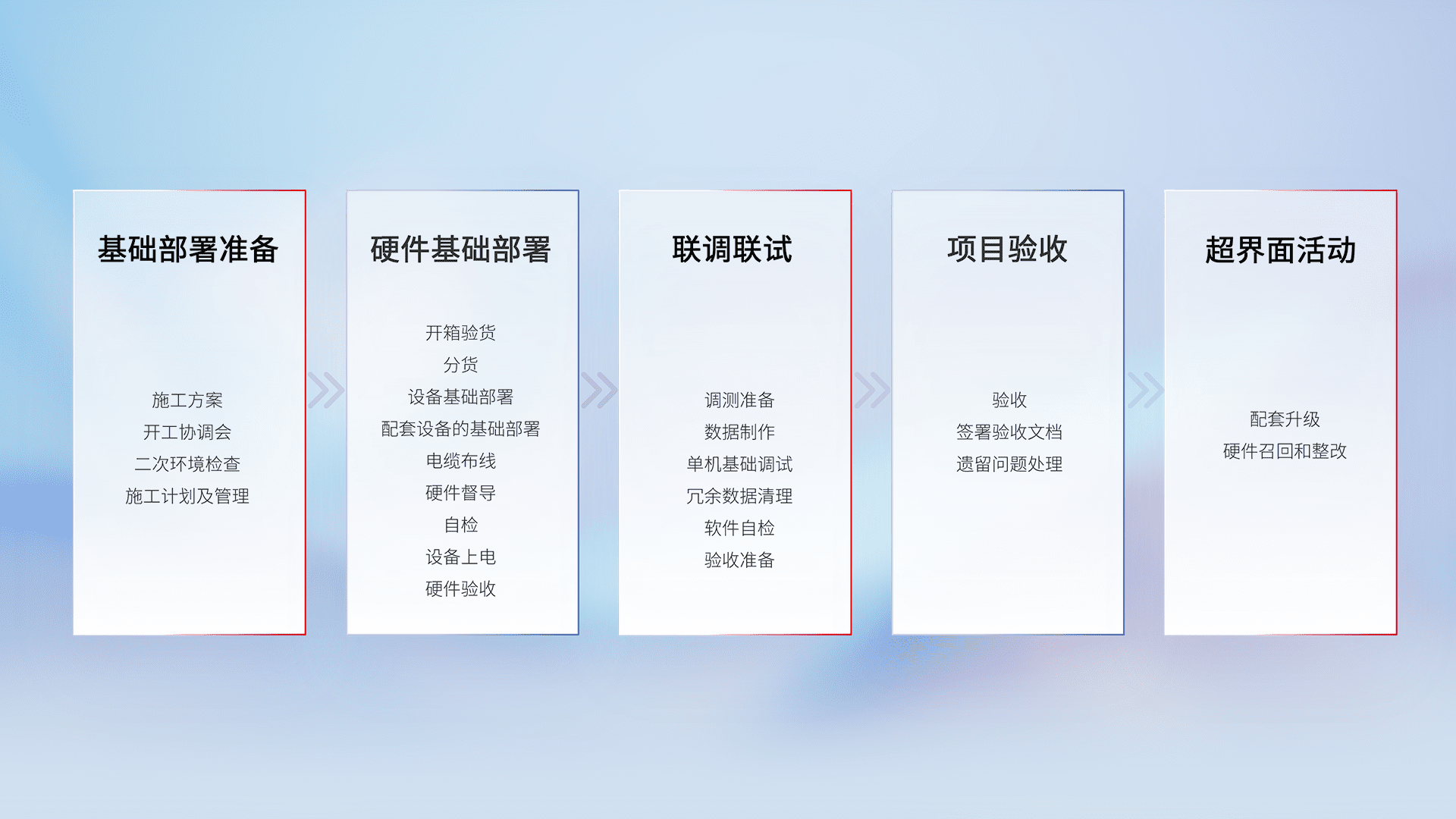 从基础部署准备、、硬件基础部署、、、、联调联试、、项目验收、、越界面活动的全过程可追溯,,保证施工质量和进度。。